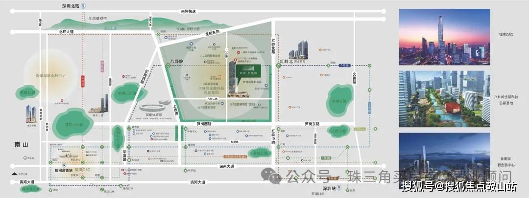 ②【创科金岭 八卦融城】八卦岭依托城市更新,以“创科金岭 八卦融城”为发展目标,着力打造“尖端产业与本土生活万象包容的、24M+24H的产城融合示范区”。未来从产业互动、生态链接和产城融合的角度重构区域关系,以金融科技为主导、智能智造等尖端产业促经济转型,必将成为福田重要的发展引擎。