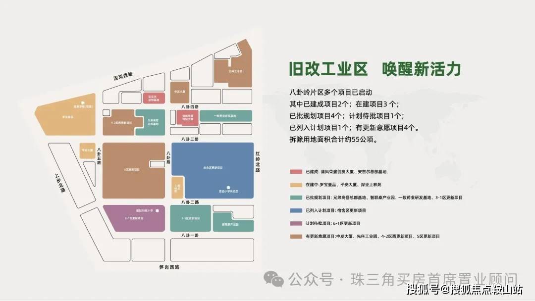 旧改工业区 唤醒新活力八卦岭片区多个项目已启动,其中已建成项目2个,在建项目3个,已批规划项目4个,列入计划项目1个,计划待批项目1个,有更新意愿项目4个。拆除用地面积合计约55公顷。深业上林苑 售楼处电话:☎